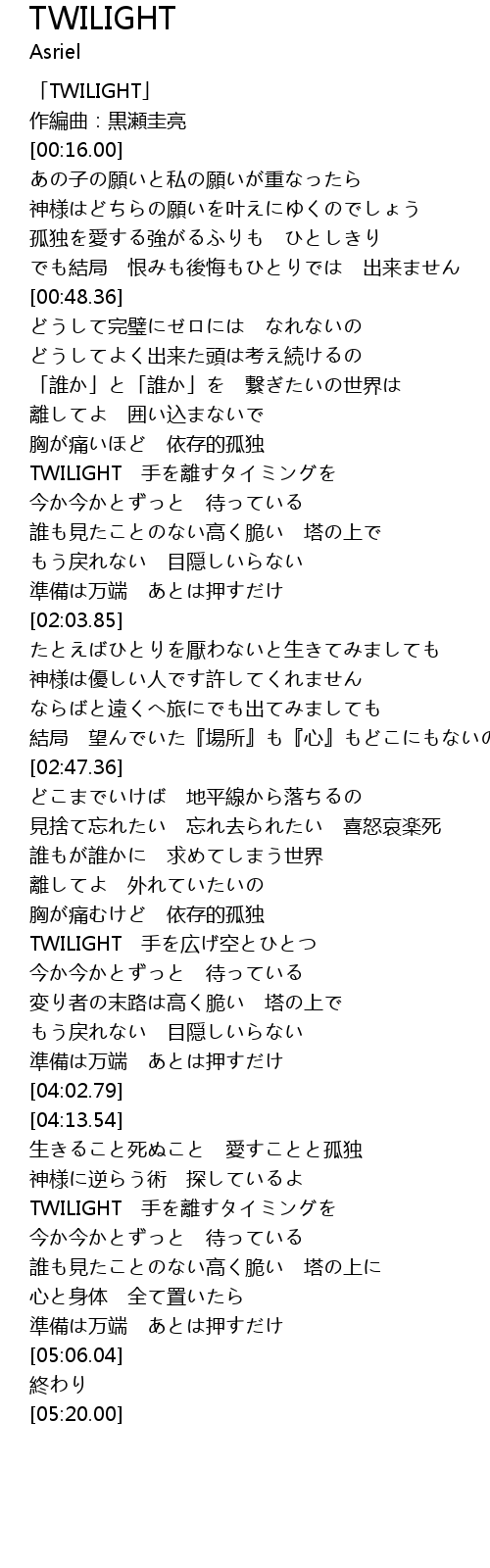 | [04:30.90] | TWILIGHT 手を離すタイミングを |