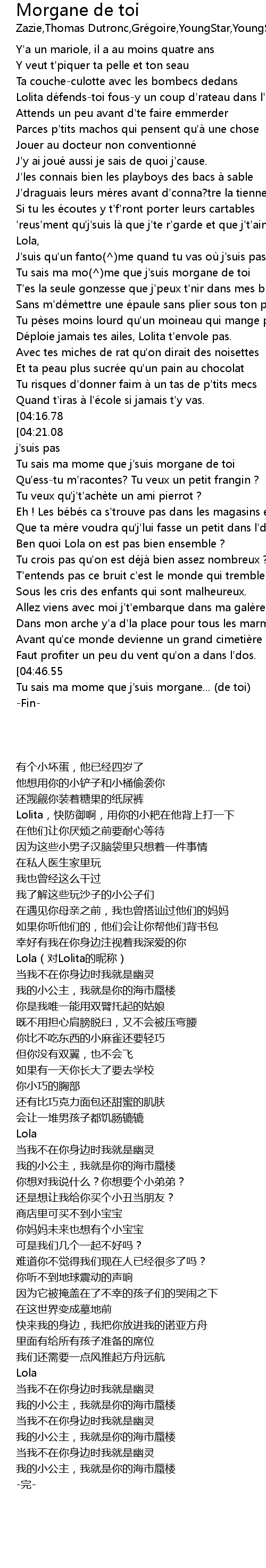 | [04:28.96][04:46.55] | Tu sais ma mome que j'suis morgane de toi. |