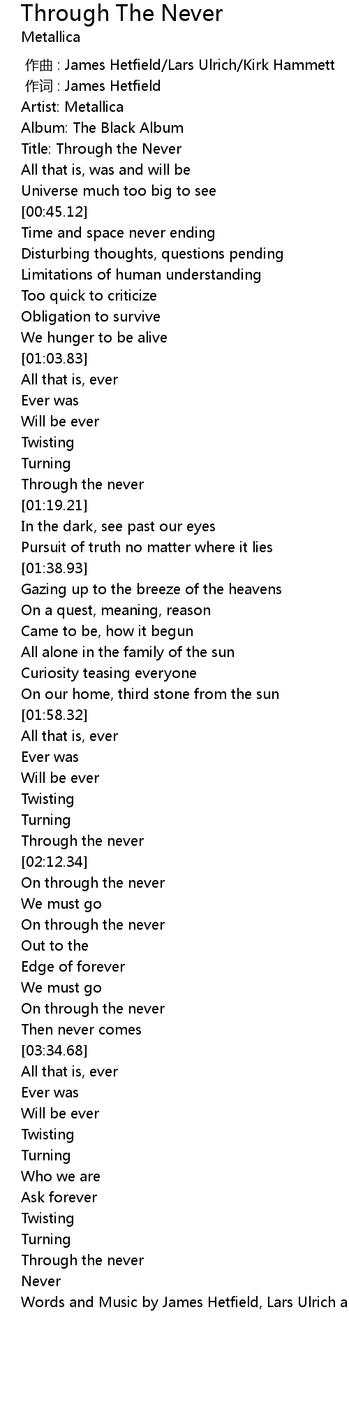 | [04:00.93] | Words and Music by James Hetfield, Lars Ulrich and Kirk Hammett |