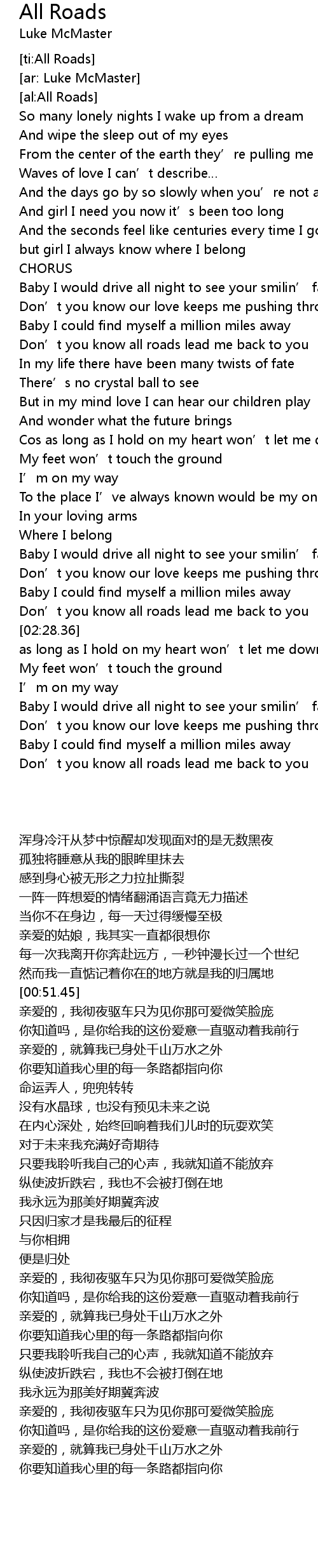 | [02:21.67] | Don’t you know all roads lead me back to you |