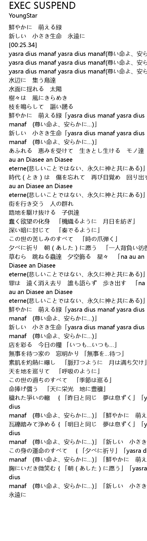 | [00:25.63] | yasra dius manaf yasra dius manaf(尊い命よ、安らかに…) |