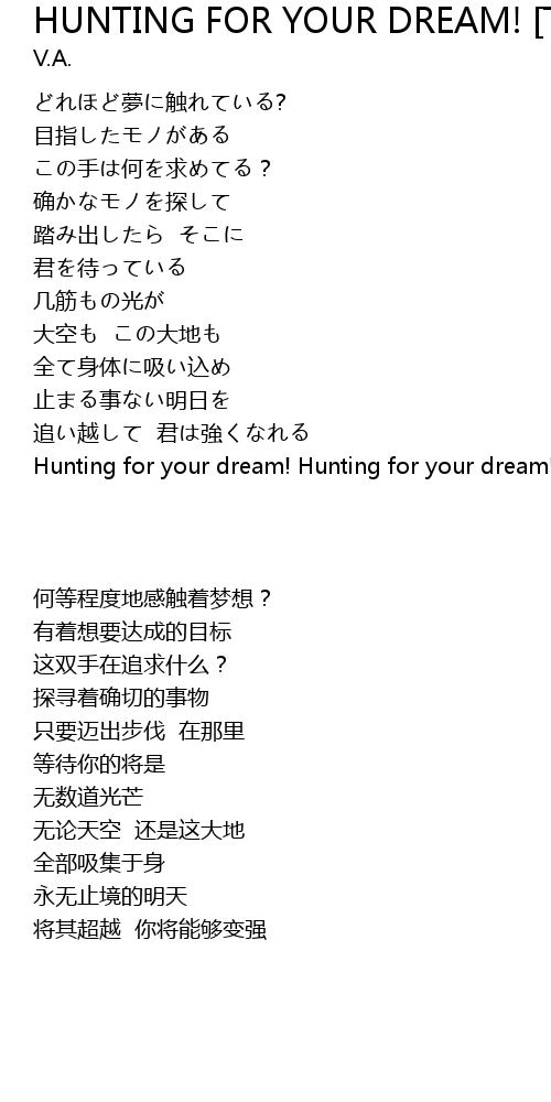 | [01:07.70] | Hunting for your dream! Hunting for your dream! |