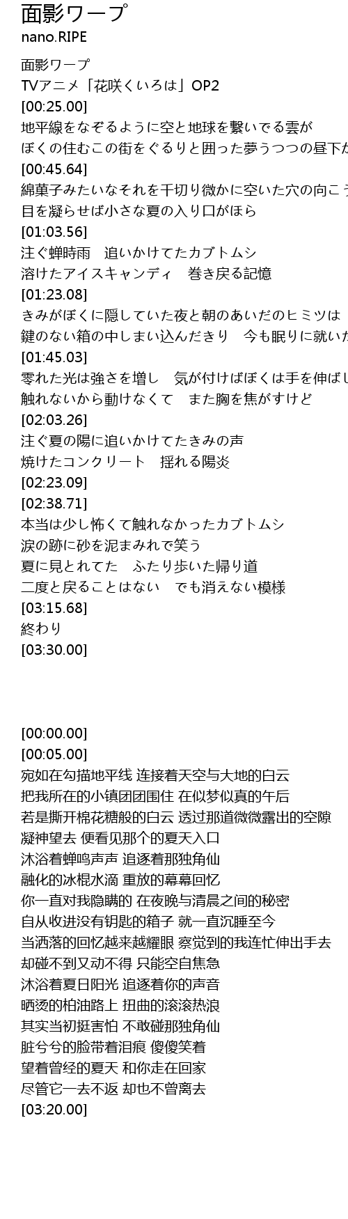 | [00:55.11] | 目を凝らせば小さな夏の入り口がほら |
