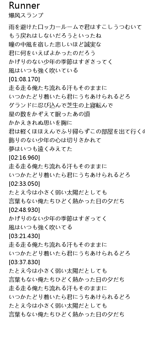 | [03:22.650] | 走る走る俺たち流れる汗もそのままに |