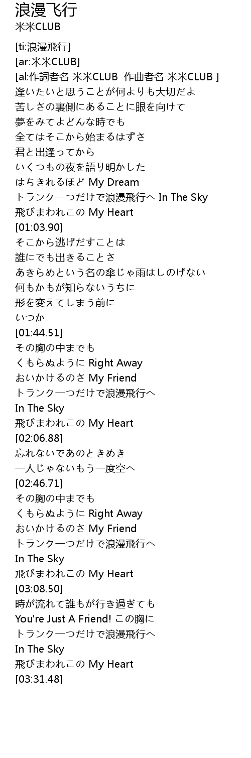 | [00:53.01] | トランク一つだけで浪漫飛行へ In The Sky |