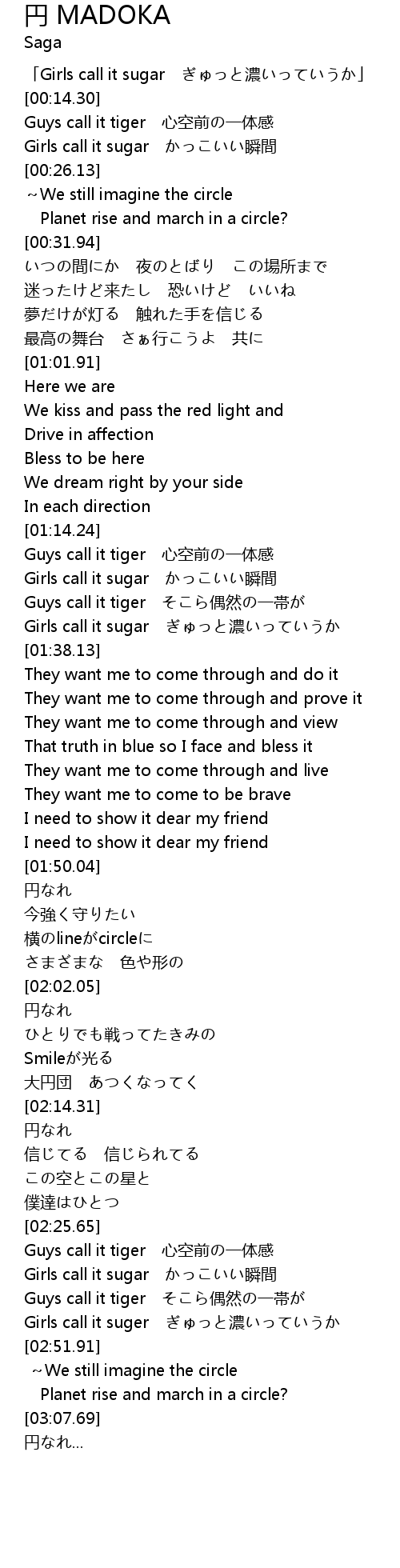 | [01:32.43] | Girls call it sugar ぎゅっと濃いっていうか |