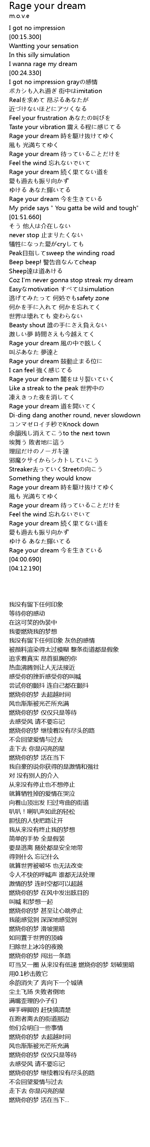 | [02:47.030] | Rage your dream gǔ dòng zhǐ wèi |