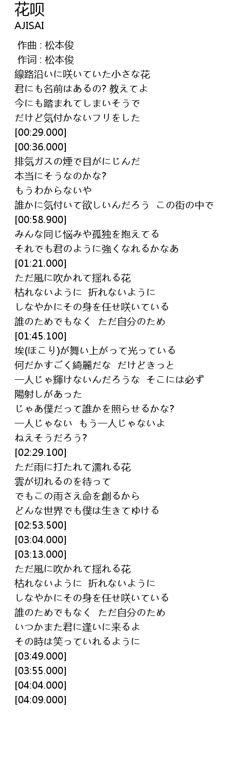 | [00:06.000] | 線路沿いに咲いていた小さな花 |