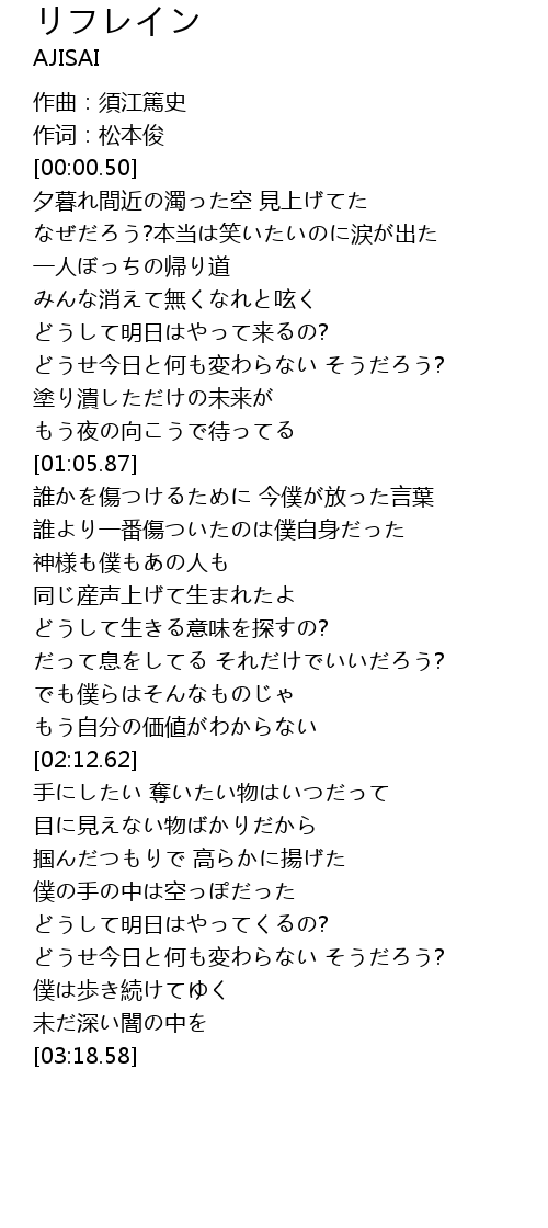 | [03:00.83] | どうせ今日と何も変わらない そうだろう? |