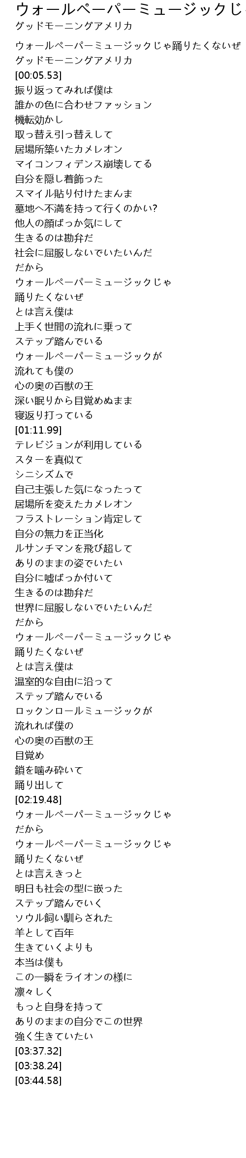 | [00:00.00] | ウォールペーパーミュージックじゃ踊りたくないぜ |