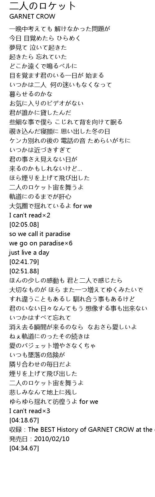 | [04:20.67] | shōu lù: The BEST History of GARNET CROW at the crest CD1 |