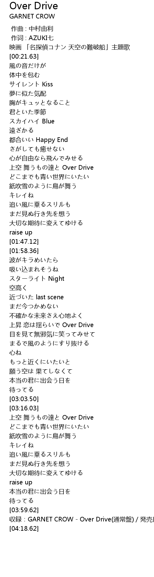 | [04:01.62] | shou lu: GARNET CROW Over Drive tong chang pan fa mai ri: 2010 04 14 |