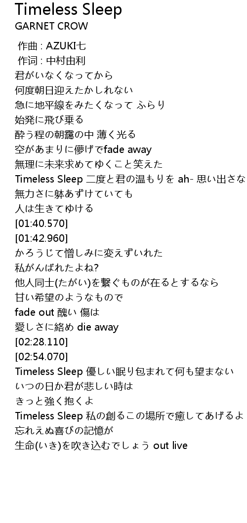 | [02:56.070] | Timeless Sleep 優しい眠り包まれて何も望まない |