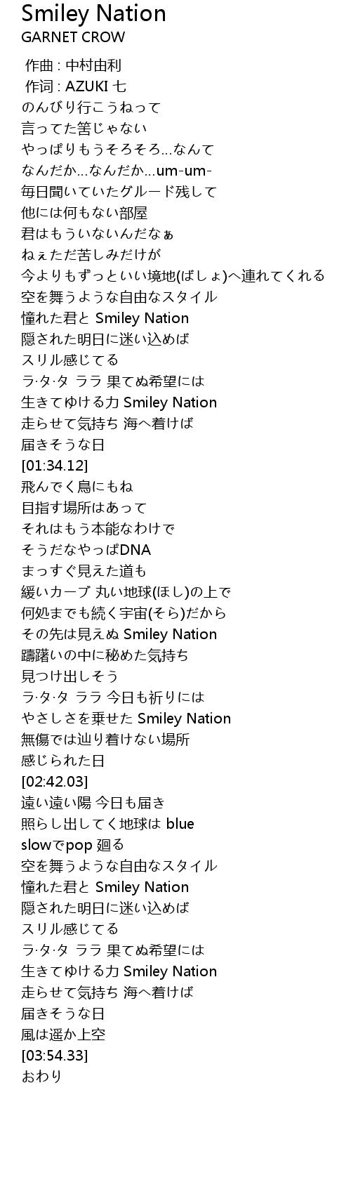 | [02:29.71] | やさしさを乗せた Smiley Nation |