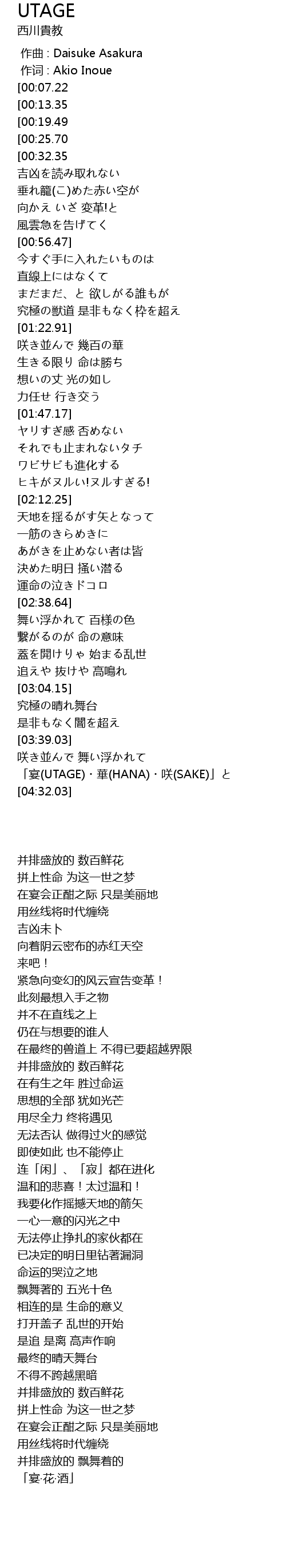 | [04:22.55] | yàn UTAGE huá HANA xiào SAKE |