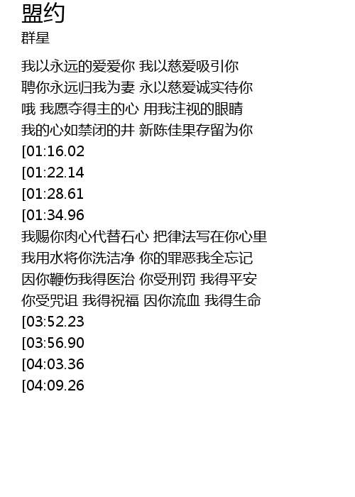 | [00:38.35] | 聘你永远归我为妻 永以慈爱诚实待你 |