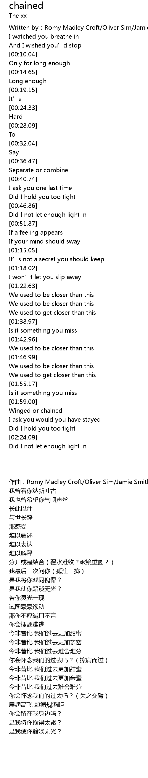 | [00:03.46] | Written by:Romy Madley Croft/Oliver Sim/Jamie Smith |