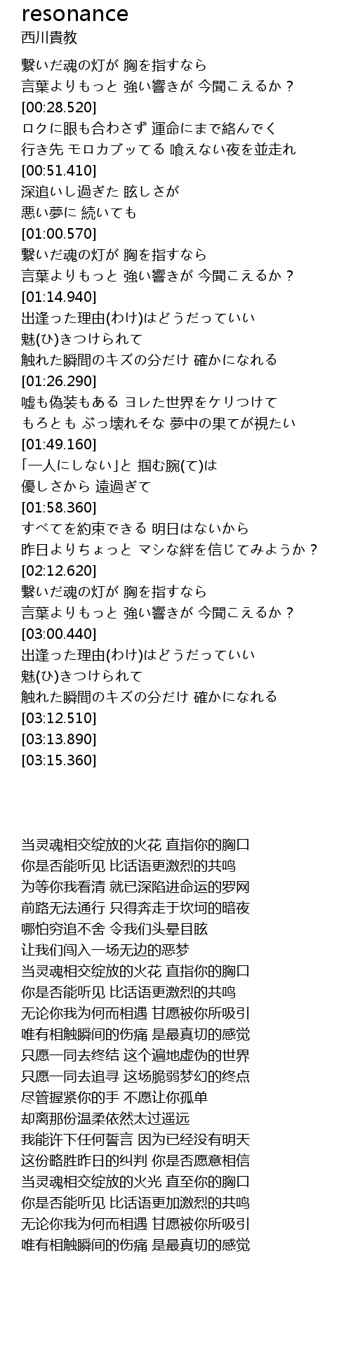 | [00:22.280] | 言葉よりもっと 強い響きが 今聞こえるか? |