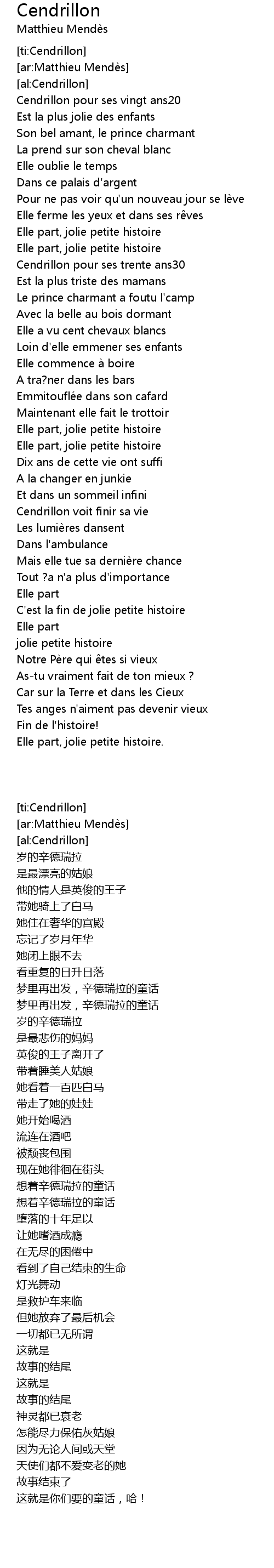 | [01:51.84] | Cendrillon voit finir sa vie |