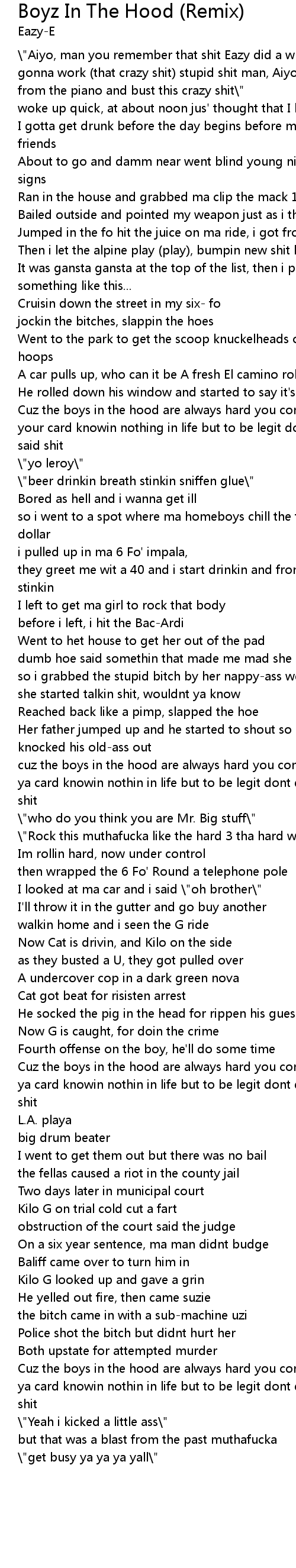 | Cuz the boys in the hood are always hard you come talkin that trash, we'll pull your card knowin nothing in life but to be legit dont quote me boy cuz i aint said shit | |