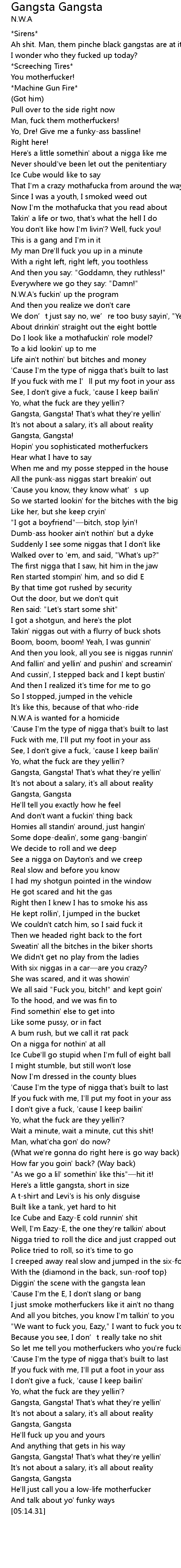 | [05:02.99] | Gangsta, Gangsta! That's what they're yellin' |