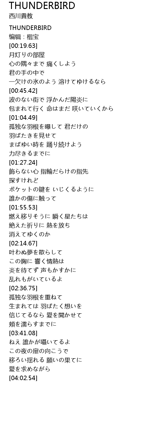| [01:07.55] | 孤独な羽根を曝して 君だけの |