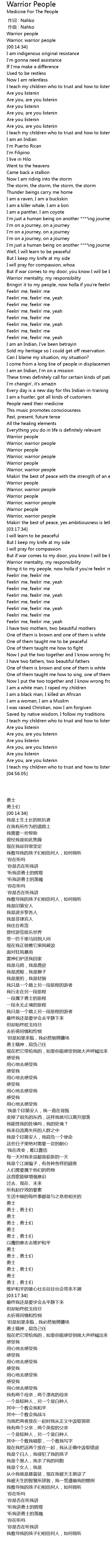 | [02:57.20] | Warrior, warrior people |