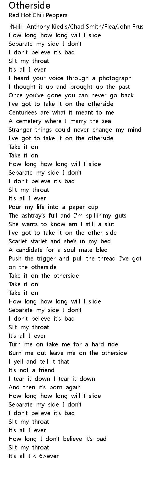 | [00:00.00] | 作曲 : Anthony Kiedis/Chad Smith/Flea/John Frusciante |