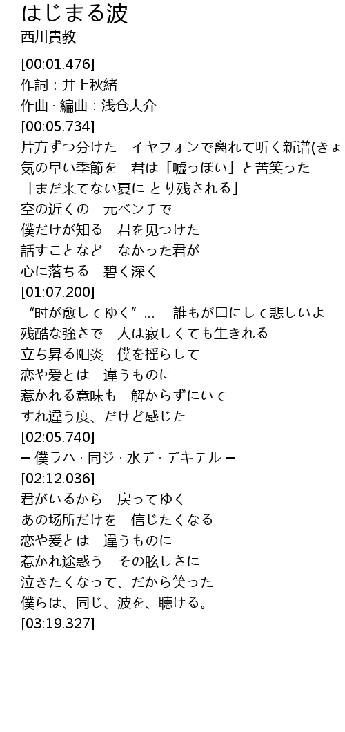 | [03:12.640] | 僕らは、同じ、波を、聴ける。 |