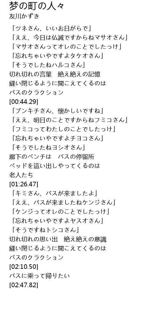 | [01:39.77] | 「キミさん、バスが来ましたよ」 |