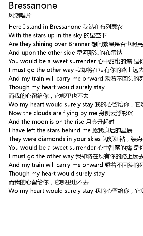 | [00:45.00] | Here I stand in Bressanone wo zhan zai bu lie se nong |