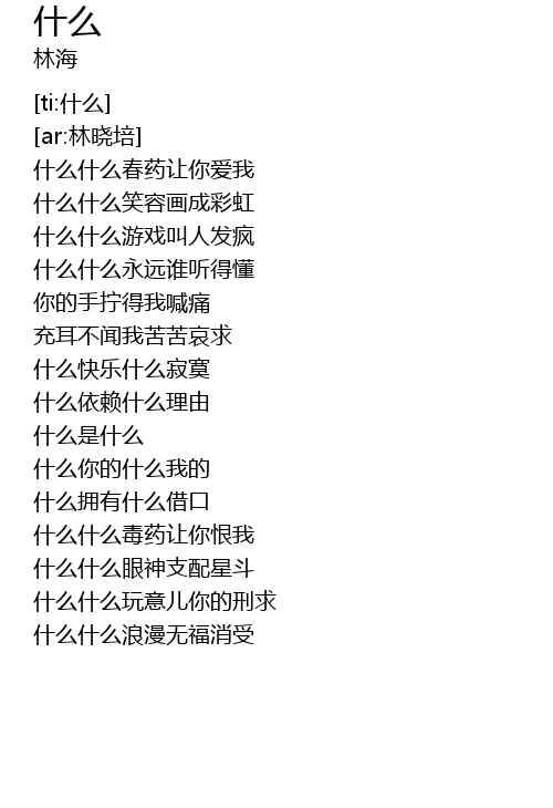 | [00:15.28] | shen me shen me chun yao rang ni ai wo |