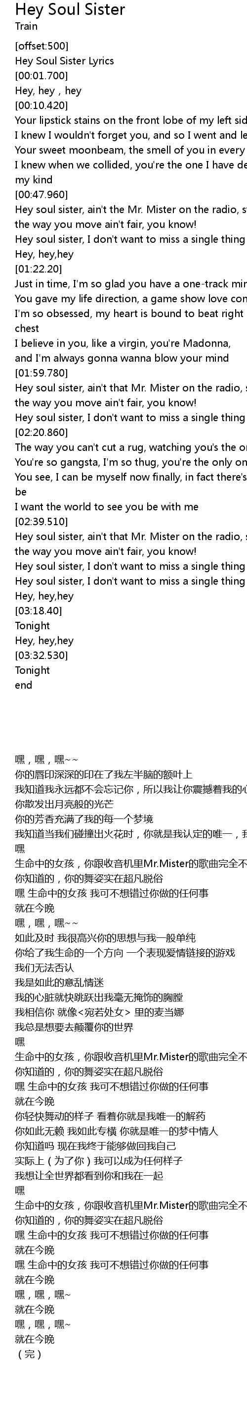 | [01:01.380] | Hey soul sister, I don' t want to miss a single thing you do... tonight |