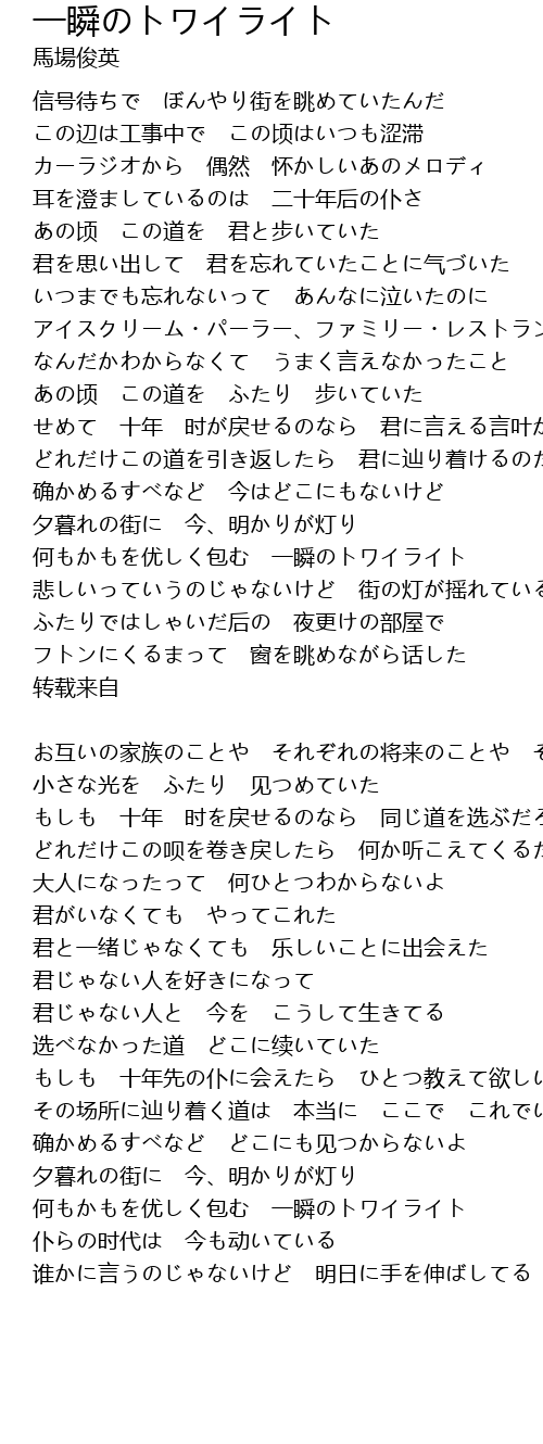 | せめて 十年 时が戻せるのなら 君に言える言叶があるよ | |
