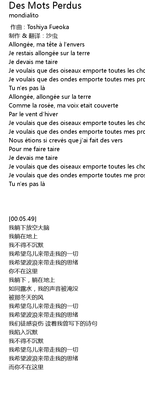 | [01:40.74] | Je voulais que des oiseaux emporte toutes les choses |