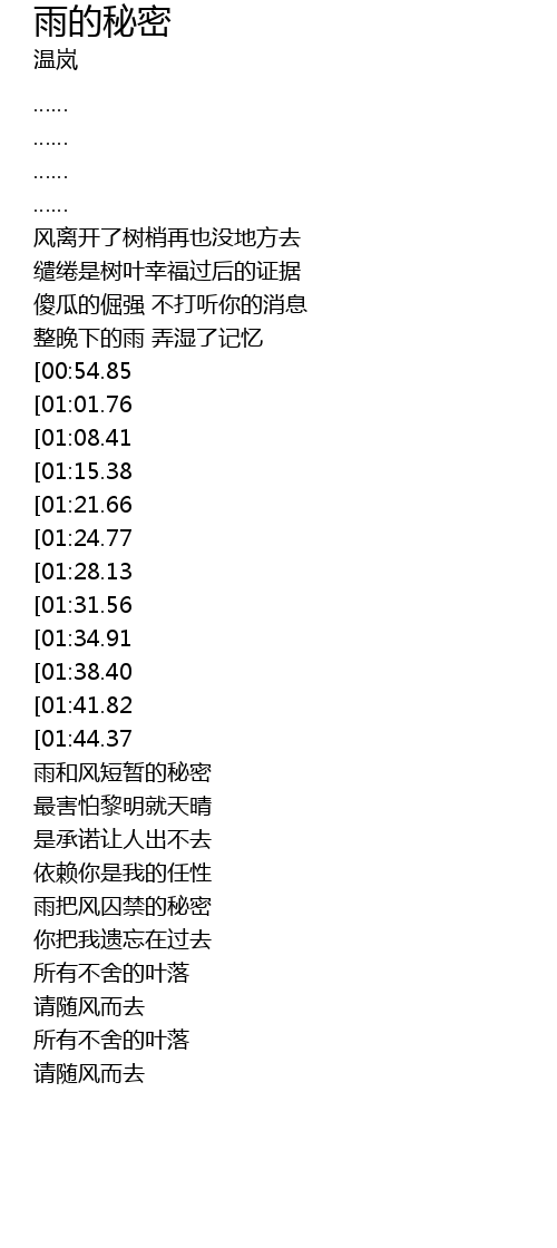 | [02:43.76][01:34.91] | 雨把风囚禁的秘密 |