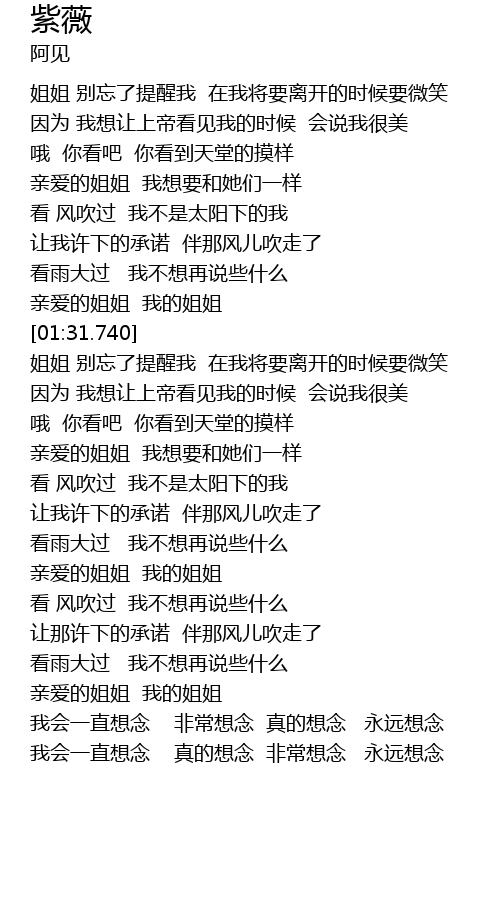 | [01:56.320] | 姐姐 别忘了提醒我 在我将要离开的时候要微笑 |