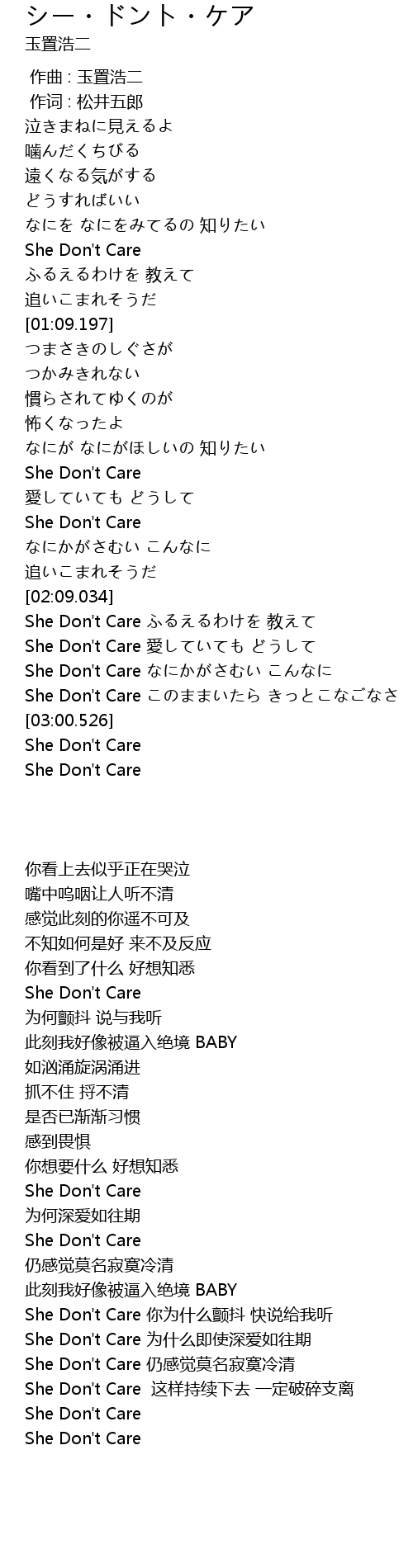 | [02:38.907] | She Don't Care なにかがさむい こんなに |