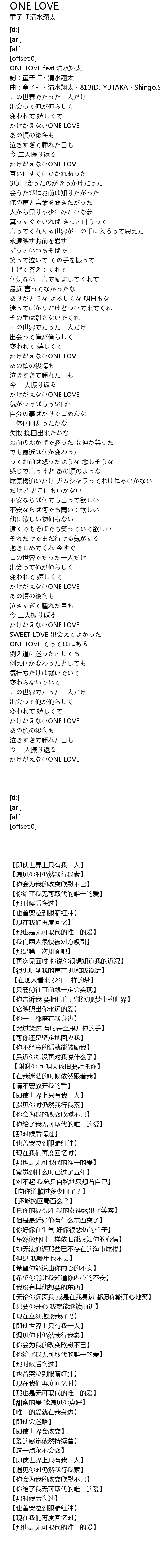 | [00:00.69] | ONE LOVE feat.清水翔太 |