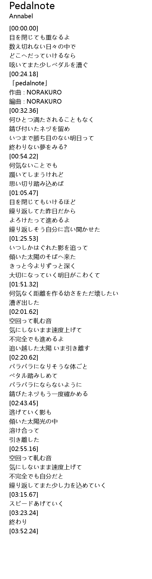 | [00:19.66] | 呟いてまた少しぺダルを漕ぐ |
