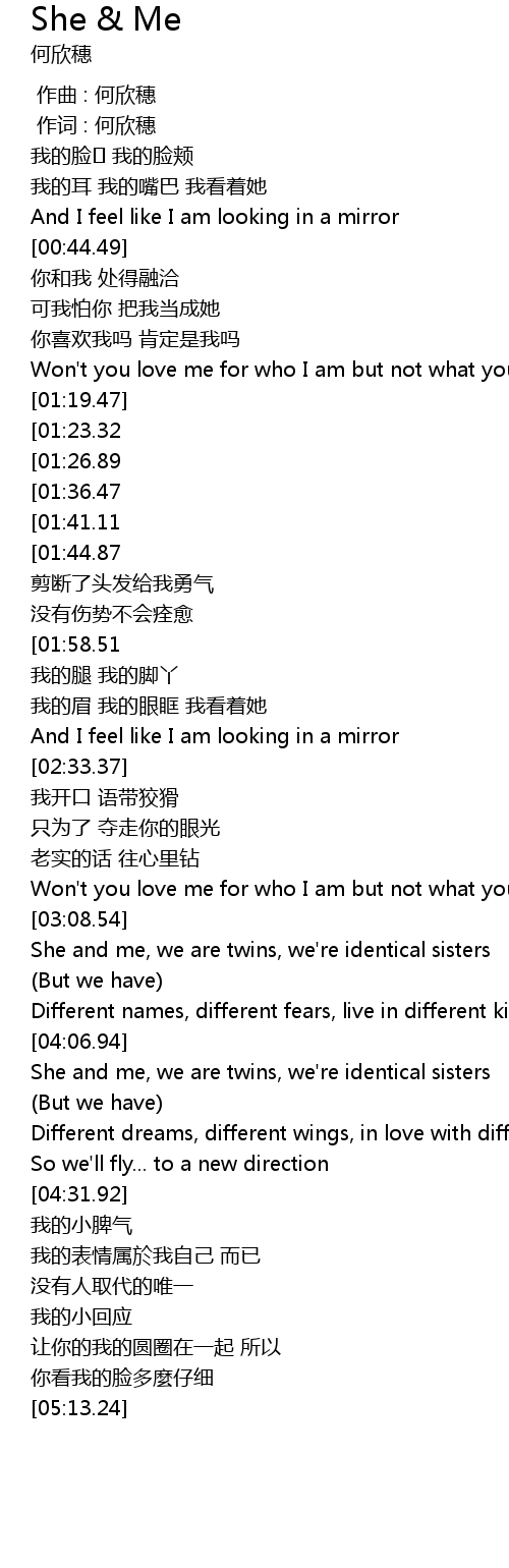 | [04:08.88] | She and me, we are twins, we' re identical sisters |