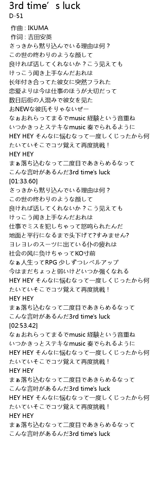 | [04:02.60] | こんな言叶があるんだ3rd time's luck |
