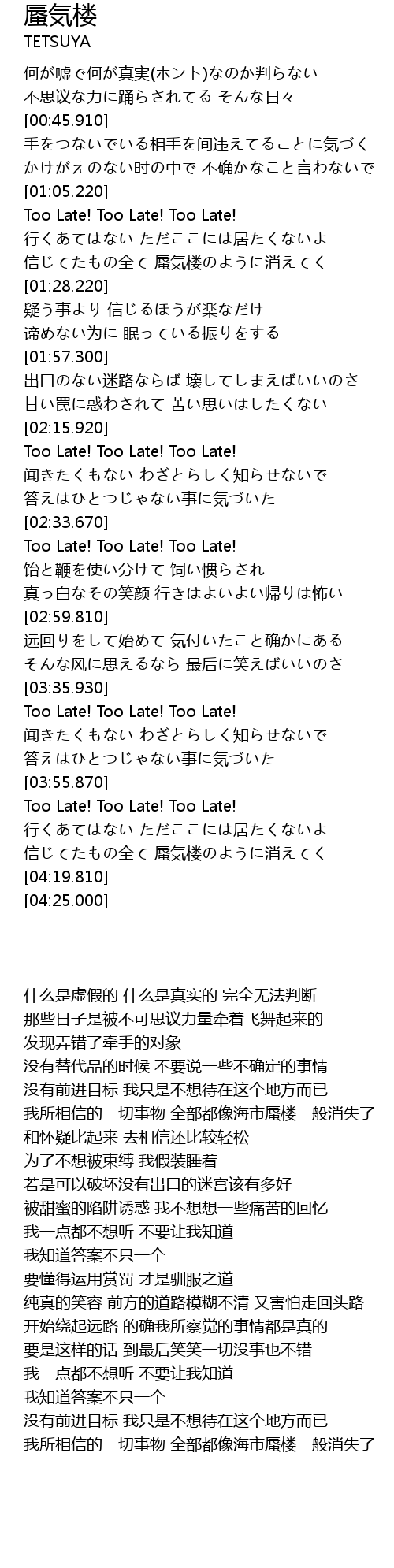 | [01:15.720] | 信じてたもの全て 蜃気楼のように消えてく |