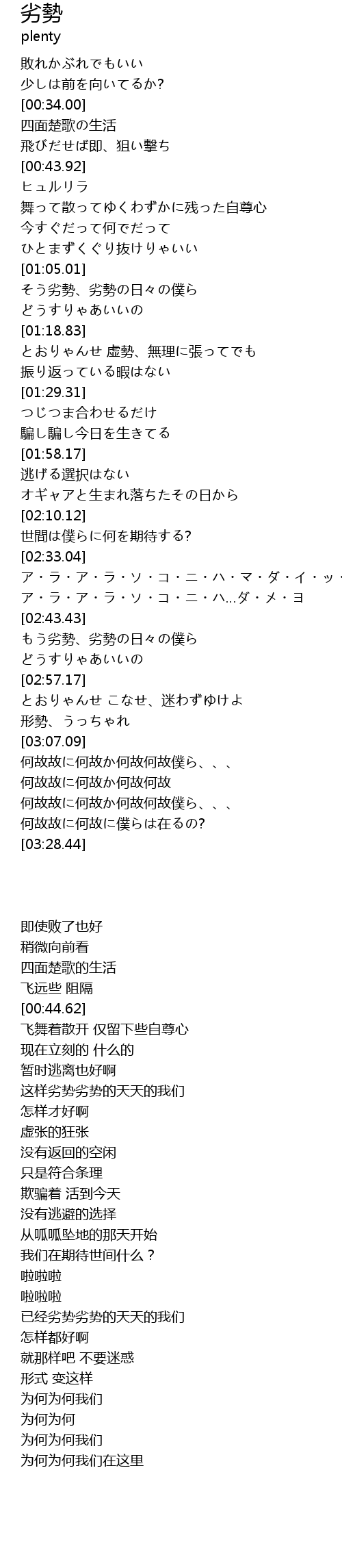| [01:09.44] | そう劣勢、劣勢の日々の僕ら |