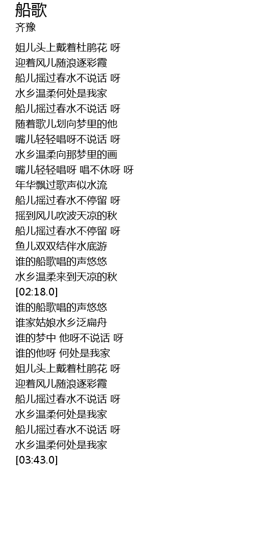 | [02:39.0] | 谁的船歌唱的声悠悠 |