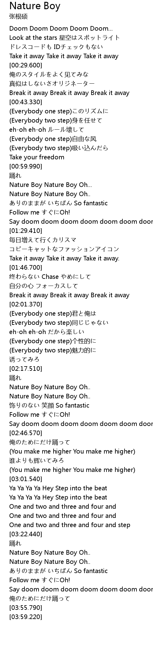 | [03:34.440] | Nature Boy Nature Boy Oh.. |