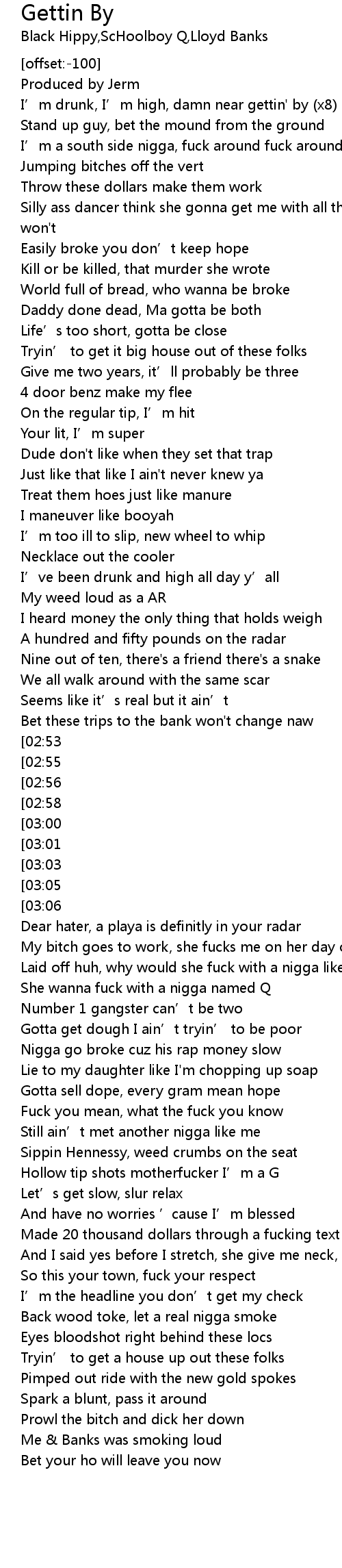 | [01:46][03:06] | I’m drunk, I’m high, damn near gettin' by (x4) |