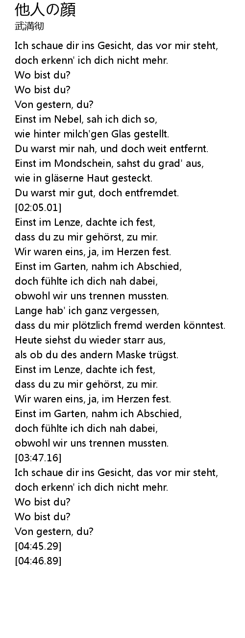 | [03:12.80] | als ob du des andern Maske trügst. |