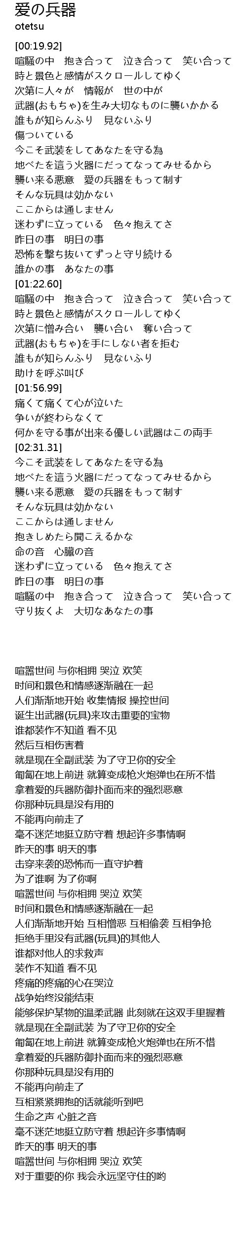 | [00:55.19] | 襲い来る悪意 愛の兵器をもって制す |