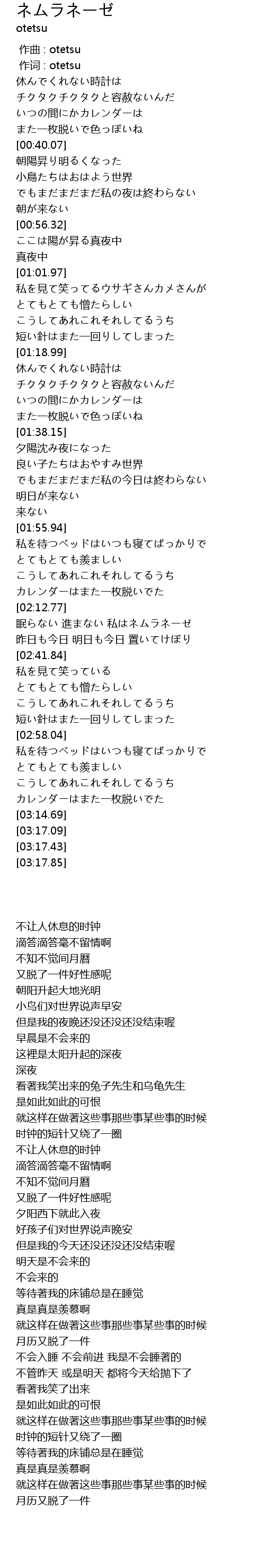 | [02:26.49] | 眠らない 進まない 私はネムラネーゼ |